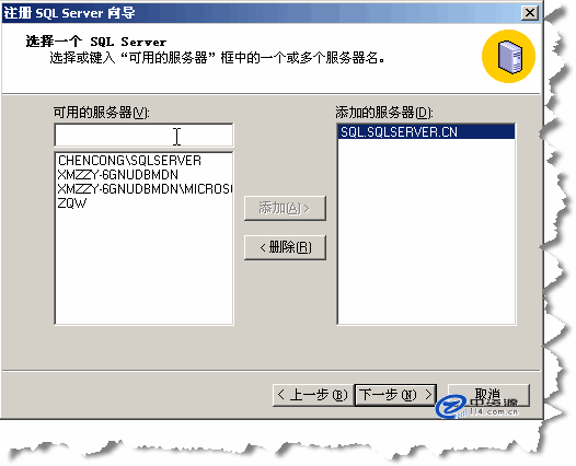四、在點“下一步”后需等待少許 即出現(xiàn)如【圖4】(等待原因是注冊向?qū)ё詣铀阉髂挠嬎銠C所在網(wǎng)絡中存在的SQL Server服務器);請于“可用的服務器”輸入您的SQL SERVER地址(例如:“SQL.SQLSERVER.CN”,注意:這里請使用您自己的SQL服務器地址)然后點“添加”按鈕,再點“下一步”即可。