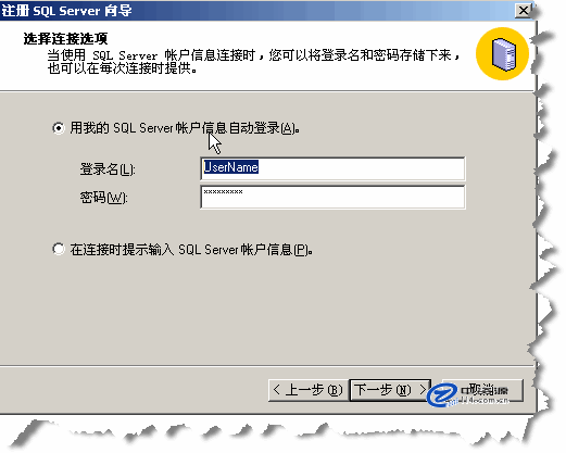 六、進入“選擇連接選項”后輸入您的SQL數(shù)據(jù)庫用戶名密碼,如【圖6】,再點下一步