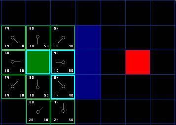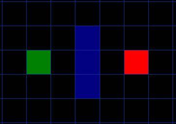 假設(shè)有人想從A點(diǎn)移動(dòng)到一墻之隔的B點(diǎn),如下圖,綠色的是起點(diǎn)A,紅色是終點(diǎn)B,藍(lán)色方塊是中間的墻。