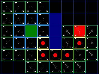 類(lèi)似的,你可以為一張確定的地形圖創(chuàng)建路徑點(diǎn)系統(tǒng),路徑點(diǎn)一般是路上,或者地牢通道的轉(zhuǎn)折點(diǎn)。作為游戲設(shè)計(jì)者,你可以預(yù)設(shè)這些路徑點(diǎn)。兩個(gè)路徑點(diǎn)被認(rèn)為是相鄰的如果他們之間的直線(xiàn)上沒(méi)有障礙的話(huà)。在冒險(xiǎn)棋的例子里,你可以保存這些相鄰信息在某個(gè)表格里,當(dāng)需要在開(kāi)啟列表中添加元素的時(shí)候使用它。然后你就可以記錄關(guān)聯(lián)的G值(可能使用兩點(diǎn)間的直線(xiàn)距離),H值(可以使用到目標(biāo)點(diǎn)的直線(xiàn)距離),其他都按原先的做就可以了。
