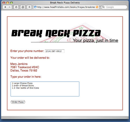 首先,得到 responseText 并使用 JavaScript split() 方法從管道符分開。得到的數(shù)組放到 response 中。數(shù)組中的第一個值 —— 上一個訂單 —— 用 response[0] 訪問,被設置為 ID 為 “order” 的字段的值。第二個值 response[1],即客戶地址,則需要更多一點處理。因為地址中的行用一般的行分隔符(“\n”字符)分隔,代碼中需要用 XHTML 風格的行分隔符 <br /> 來代替。替換過程使用 replace() 函數(shù)和正則表達式完成。最后,修改后的文本作為 HTML 表單 div 中的內(nèi)部 HTML。結果就是表單突然用客戶信息更新了,如圖 4 所示。