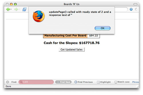 現(xiàn)在在瀏覽器中打開 Web 應(yīng)用程序,并激活您的請(qǐng)求。要更好地看到這段代碼的效果,請(qǐng)使用 Firefox 或 Internet Explorer,因?yàn)檫@兩個(gè)瀏覽器都可以報(bào)告出請(qǐng)求過(guò)程中所有可能的就緒狀態(tài)。例如在就緒狀態(tài) 2 中,就沒(méi)有定義 responseText (請(qǐng)參見 圖 3);如果 JavaScript 控制臺(tái)也已經(jīng)打開了,您就會(huì)看到一個(gè)錯(cuò)誤。