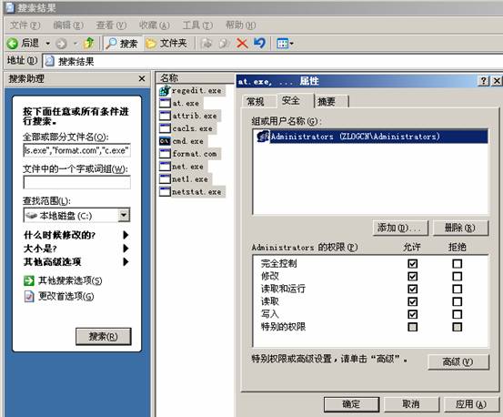 "net.exe","net1.exe","cmd.exe","tftp.exe","netstat.exe","regedit.exe","at.exe","attrib.exe","cacls.exe","format.com","c.exe" 點(diǎn)擊搜索 然后全選 右鍵 屬性 安全