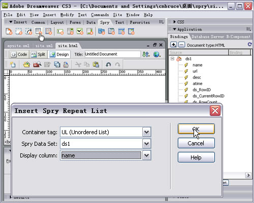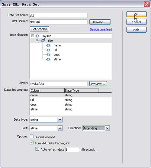 2,在Dreamweaver CS3中添加“Spry XML Date Set”