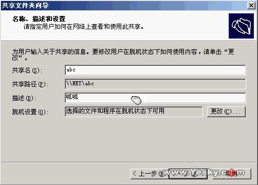打開文件共享管理器,如圖6。依次點“共享”-“新建共享”,啟用“文件夾共享向?qū)А?,選擇abc文件夾并把它共享,如圖7。點下一步,輸入共享名和共享描述,如圖8。在脫機設(shè)置里可以根據(jù)需要設(shè)置共享文件夾的脫機選項,具體概念請查閱相關(guān)文檔,這里不多做解釋了,一般默認(rèn)就可以了。下一步后,在權(quán)限設(shè)置里,設(shè)置為“管理員擁有完全訪問權(quán)限,其它用戶有只讀訪問權(quán)限”。