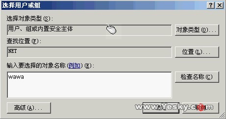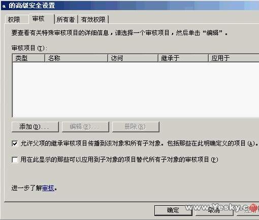 上面提到了,我們要對每個用戶訪問文件夾的操作進(jìn)行跟蹤并形成日志,要實現(xiàn)這個功能就要給abc文件夾添加審核。打開abc文件夾的屬性,然后打開“安全”標(biāo)簽,點“高級”按鈕,在“審核”標(biāo)簽里給這個文件夾設(shè)置審核,如圖9。點“添加”按鈕,在"選擇用戶和組"對話框里填入“wawa”組,如圖10,確定后把完全控制的成功和失敗都設(shè)置為審核項目,如圖11。