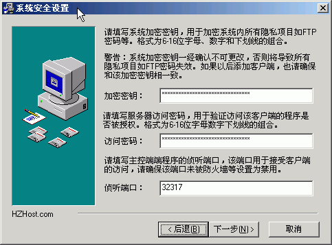 填寫系統(tǒng)加密密鑰,該密鑰用于加密FTP密碼等關(guān)鍵數(shù)據(jù),由于使用不同的加密密鑰得出的密碼將各不相同,因此可以保證不同的HZHOST使用者不能互相猜解密碼。另一方面,如果您的系統(tǒng)重裝,那么加密密鑰也應(yīng)該和舊系統(tǒng)完全一致。