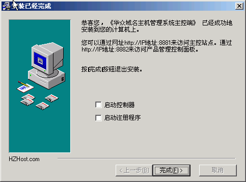 至此,HZHOST系統(tǒng)主控端已經(jīng)安裝完畢,您可以通過http://IP地址:8881來訪問主控站點(diǎn),(如您的IP地址為218.1.1.1,則您可以通過http://218.1.1.1:8881來訪問主控端點(diǎn)),您可以自主綁定您的其它域名。