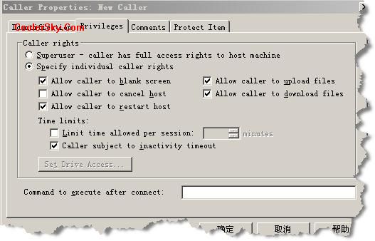 ·呼叫者:指的是可以創(chuàng)建連接到本機(jī)的用戶(hù)帳號(hào)及密碼。在這 里設(shè)置允許哪些用戶(hù)能夠進(jìn)行遠(yuǎn)程控制以及控制的權(quán)限,單擊“New Item”按鈕,彈出設(shè)置新用戶(hù) 的對(duì)話(huà)框,設(shè)置好一個(gè)新的用戶(hù)名和登錄密碼,以及相應(yīng)的權(quán)限后。單擊“確定”保存。