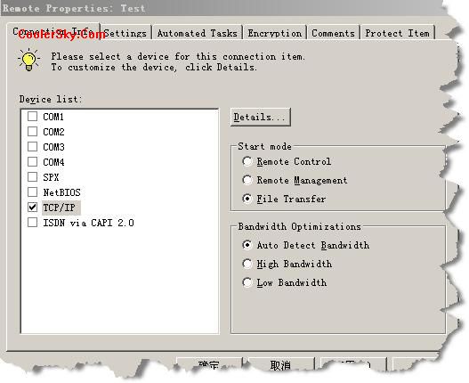 ·連接信息:設(shè)置選項(xiàng)與被控端的設(shè)置基本相 同,不同的是主控端只能夠選擇一種連接方式,同時(shí)在選項(xiàng)卡上還可以設(shè)置“Start mode”如其中 的“File transfer”的復(fù)選框,選中之后可以達(dá)到與被控端連接時(shí)直接進(jìn)入文件傳輸界面,而不進(jìn) 入遠(yuǎn)程操作界面的效果。