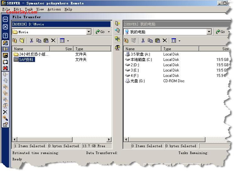 文件傳輸功能可以說(shuō)是PCAnywhere最具特色的一個(gè)功能。文件傳輸在遠(yuǎn)程控制中起著相當(dāng)重要的作用。遠(yuǎn) 程用戶(hù)在遠(yuǎn)程傳輸文件時(shí)能暫時(shí)中止遠(yuǎn)程操作功能,使文件傳輸線(xiàn)路更加穩(wěn)定。此外,PCAnywhere提供同 步文件夾的方式傳輸文件,還可以通過(guò)自 動(dòng)化任務(wù),讓軟件按照用戶(hù)的設(shè)置,在指定時(shí)間連接遠(yuǎn)程 計(jì)算機(jī),進(jìn)行指定的文件傳輸操作或同步指定的文件夾。