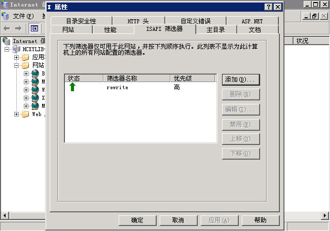 確定后,將網(wǎng)站停止再啟動,在屬性ISAPI 篩選器里看到所加的規(guī)則已經(jīng)出現(xiàn)綠色的箭頭。