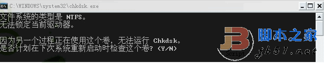 (3)開始---運行---chkdsk /f,這時會提醒“文件系統(tǒng)的類型是 NTFS。無法鎖定當(dāng)前驅(qū)動器。因為另一個過程正在使用這個卷,無法運行 Chkdsk。是否計劃在下次系統(tǒng)重新啟動時檢查這個卷? (Y/N)”(見下圖),輸入“Y”,然后重新啟動計算機(jī),開機(jī)后會自動檢測硬盤并修復(fù),再進(jìn)入系統(tǒng),一切OK!