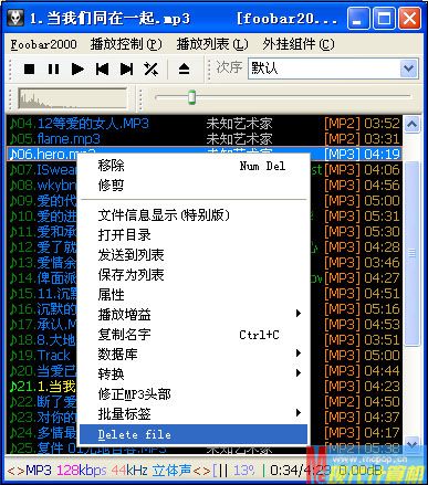好了,以后要在Foobar 2000中徹底刪除MP3文件,只需要播放列表中選中不需要的媒體文件,在其上點右鍵,從彈出的右鍵菜單中選擇“Delete file”命令(圖1),這時會彈出一個“Delete file from disk”(從磁盤刪除文件)問詢框,點擊“OK”按鈕就可以直接將當前媒體文件放入回收站,而點擊“Cancel”則可取消當前操作。