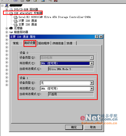 【做法如下】:右鍵點(diǎn)擊“我的電腦-屬性”,然后點(diǎn)擊“硬件”接著點(diǎn)擊“設(shè)備管理器”,在其中打開“IDE ATA/PATA控制器”(不同芯片略有差異),然后分別進(jìn)入主要和次要IDE通道,如圖:選擇“高級設(shè)置”,在這里找到“當(dāng)前傳送模式”為“不適用”的一項(xiàng)(這就是閑置的IDE通道所對應(yīng)的),將此項(xiàng)的“設(shè)備類型”設(shè)置為“無”,確定即可。