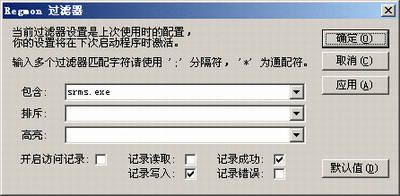 第一步:運行Regmon,單擊菜單“選項→過濾器→高亮”,在這里需要設置過濾條件,讓Regmon只顯示超級兔子對注冊表修改的數(shù)據(jù)。在“包含”欄中輸入超級兔子魔法設置的進程文件名“srms.exe”(見圖1),并在下面只選中“記錄寫入”、“記錄成功”兩個選項,其他要監(jiān)視的選項全部取消,這樣可以大大減少無用監(jiān)視數(shù)據(jù),提高分析效率。