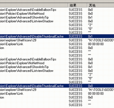 這兩個記錄對應的“路徑”列指向的注冊表鍵值都是相同的,即HKEY_CURRENT_USER\Software\Microsoft\Windows\CurrentVersion\Explorer\Advanced主鍵下的“DisableThumbnailCache”鍵值。由此我們可以分析得出結(jié)論,該鍵值為“1”表示禁止使用縮略圖加速,鍵值為“0”表示允許使用縮略圖加速功能。