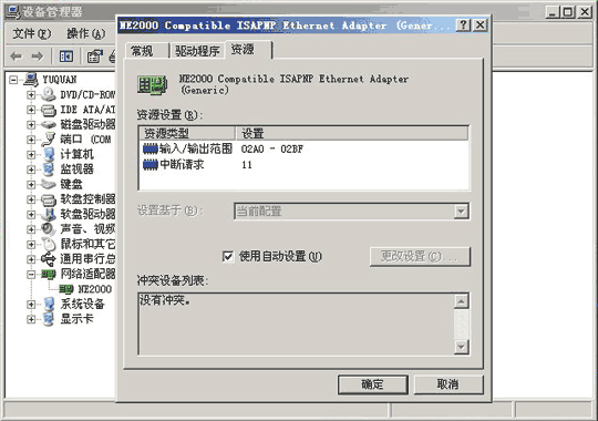解決硬件沖突的方法是:在屏幕左上角的“我的電腦”上按鼠標(biāo)右鍵,選擇“屬性”中的“設(shè)備管理器”,如果兩塊網(wǎng)卡有硬件沖突,就會(huì)在“網(wǎng)絡(luò)適配器”的位置出現(xiàn)一個(gè)醒目的驚嘆號(hào)。雙擊帶有驚嘆號(hào)的網(wǎng)卡,切換到“資源”選項(xiàng)卡,這里可以看到究竟是哪些參數(shù)產(chǎn)生的硬件沖突,以及是跟哪些設(shè)備發(fā)生的沖突。現(xiàn)在,您要做的是:先將“使用自動(dòng)設(shè)置”復(fù)選框里的小勾消去,然后再雙擊有紅色標(biāo)志的參數(shù),并對(duì)它的數(shù)值進(jìn)行強(qiáng)制指定,直到“沖突設(shè)備列表”窗口中出現(xiàn)“沒有沖突”的提示為止。