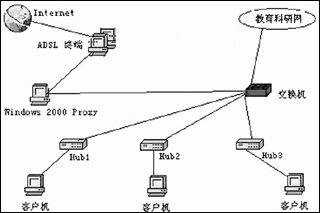 就ADSL而言,目前ADSL接入方式提供兩種終端,一種為網(wǎng)吧用戶,一種為家庭用戶。本方案以ADSL家庭接入方式(對(duì)于學(xué)校來說采用任何一種方式均可)為例,使局域網(wǎng)通過Proxy服務(wù)器上網(wǎng),為了減少?zèng)_突域和不影響速度,我們把Proxy服務(wù)器接在交換機(jī)的一個(gè)端口上。網(wǎng)絡(luò)結(jié)構(gòu)示意圖如附圖。