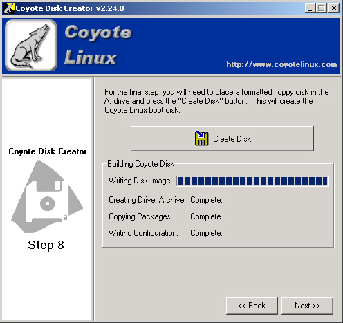 9.接下來將軟盤放進軟驅(qū),點擊“Creat Disk”按鈕,稍等片刻。coyote Linux軟盤就大功告成了(見圖11)。