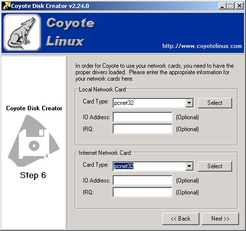 首先到http://www.vortech.net/ 上下載coyote Linux的最新版本,到目前為止,最新版本是2.4.0。注意:其網(wǎng)站上提供了若干平臺的制作版本,我們一般采用Windows Disk Creation Wizard v2.24.0版本,意思是在windows下的生成版本。下載后解壓縮,運行coyote.exe文件。開始制作軟盤過程