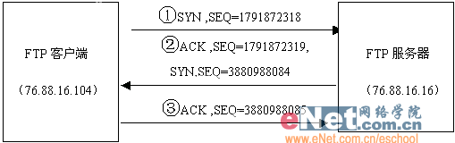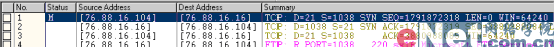 第1行表示:FTP客戶端76.88.16.104從1038端口向FTP服務(wù)器76.88.16.16的21端口發(fā)起一個帶有SYN標(biāo)志的連接請求,初始序列號SEQ=1791872318。