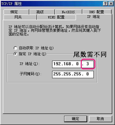 第二步,然后選中“IP地址”中的“指定IP地址”,將本機(jī)IP地址設(shè)為除192.168.0.1之外的任一尾數(shù)在1-255之間的地址,例如192.168.0.2或192.168.0.3……等等,總之其尾數(shù)要保證與局域網(wǎng)的主機(jī)和其它電腦的該地址不同。子網(wǎng)掩碼同樣為255.255.255.0。(如下圖)