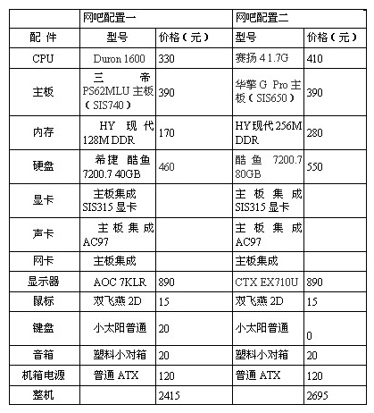 如何以更少的投資組建更適合于需求的網(wǎng)吧電腦是許多讀者所關(guān)心的問(wèn)題,我們特為大家推出了兩款性價(jià)比很高的配機(jī)方案。(見(jiàn)下表)