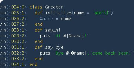 在上面的類代碼中定義了一個(gè)稱為Greeter的類和一些類方法,其中出現(xiàn)了一些新的“關(guān)鍵詞”:請注意“@name”,它是類的實(shí)例變量,并對類中的所有方法(say_hi和say_bye方法)都有效。