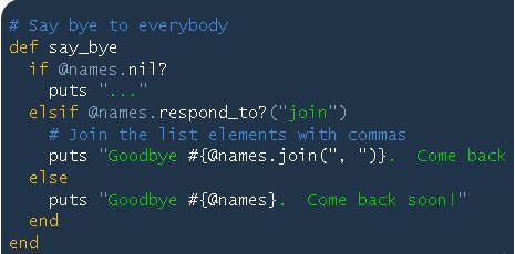 say_bye方法沒有使用each,而是檢查@names是否具有join方法,如果具有join方法,則調(diào)用join方法。否則它將直接打印@names變量。