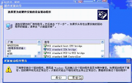 •  在出現(xiàn) 更新驅(qū)動(dòng)程序警告 之后,點(diǎn)擊其中的 ( Y ) ,該設(shè)備驅(qū)動(dòng)會(huì)被添加,然后設(shè)備管理器中此項(xiàng) 未知設(shè)備 的提示將會(huì)消失,在系統(tǒng)設(shè)備中會(huì)添加一項(xiàng) PCI standard ISA bridge