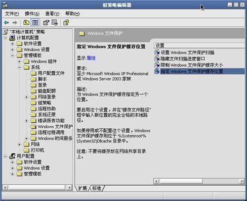 在運行中輸入"CMD"并回車,打開命令提示行窗口,然后在其中輸入"sfc /purgecache"并回車,這將會刪除前面提到的%systemroot%/system32/dllcache文件夾中所有的備份文件,接著繼續(xù)輸入"sfc /cachesize=0"并回車,這將使得系統(tǒng)以后不會消耗硬盤空間來保存?zhèn)浞莸南到y(tǒng)文件。需要注意,經(jīng)過這樣的操作以后如果有重要的系統(tǒng)文件需要恢復,操作系統(tǒng)會直接要你插入系統(tǒng)安裝光盤。如果你嫌麻煩或者只是想要減小系統(tǒng)盤的體積而不想影響穩(wěn)定性,也可以通過配置組策略把備份文件夾轉(zhuǎn)移到其他分區(qū)。在運行中輸入"gpedit.msc"并回車,打開組策略編輯器,然后定位到"計算機配置-管理模板-系統(tǒng)-Windows文件保護",然后分別通過右側(cè)的"指定Windows文件保護緩存位置"和"限制Windows文件保護緩存大小"來轉(zhuǎn)移和重新設(shè)置緩存文件夾的位置和大?。▓D五)。注意:如果你想手工刪除,記得只能刪除這個文件夾中的文件而不是文件夾本身。