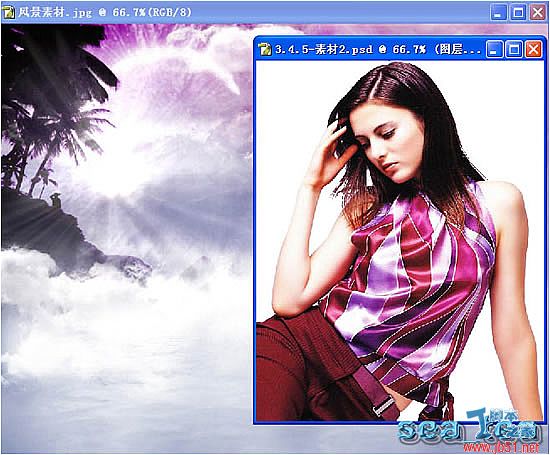 將MM扣出后,拖入風(fēng)景素材圖中,調(diào)整好位置,如圖: