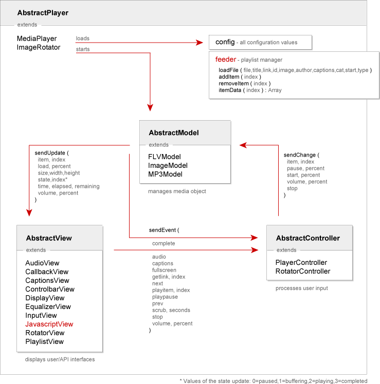 Additionally, I have made the controller a public object, so you can control the mediaplayer with the sendEvent() function from anywhere in your flash site (the schematic above has a list of all sendEvent() options). Let's continue the small script above: