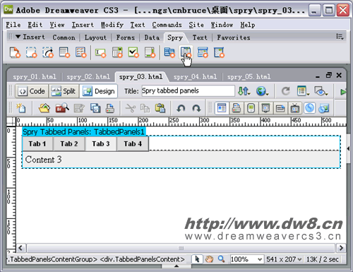 對(duì)于Windows操作系統(tǒng)用戶來(lái)說(shuō),選項(xiàng)卡功能并不陌生,但要在網(wǎng)頁(yè)中實(shí)現(xiàn)該功能確不是很輕松,現(xiàn)在借助Spry tabbed panels可以很快完成,并且在Dreamweaver CS3中可以直接選擇各個(gè)主選項(xiàng)卡內(nèi)的內(nèi)容進(jìn)行編輯。