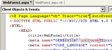 | <%@ Page Language="vb" Trace="true" TraceMode="SortByCategory" AutoEventWireup="false" Codebehind="WebForm1.aspx.vb" Inherits="WebApplication1.WebForm1" %> |