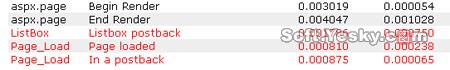| Private Sub Page_Load(ByVal sender As System.Object, _ ByVal e As System.EventArgs) _ Handles MyBase.Load Trace.TraceMode = TraceMode.SortByCategory '此處放置初始化頁面的用戶代碼 Trace.Warn("Page_Load", "Page loaded") If Not IsPostBack Then ' 執(zhí)行一些操作 Trace.Warn("Page_Load", "Not in a postback") Else Trace.Warn("Page_Load", "In a postback") End If End Sub Private Sub ListBox1_SelectedIndexChanged(ByVal sender _ As System.Object, ByVal e As _ System.EventArgs) Handles _ ListBox1.SelectedIndexChanged Trace.Warn("ListBox", "Listbox postback") End Sub |