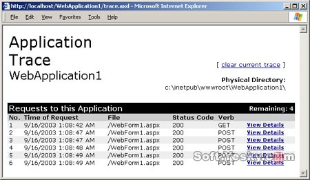 當(dāng)應(yīng)用程序被載入后,追蹤信息沒有顯示在頁面上。為了查看追蹤信息,我們需要使用追蹤查看器(trace.axd):