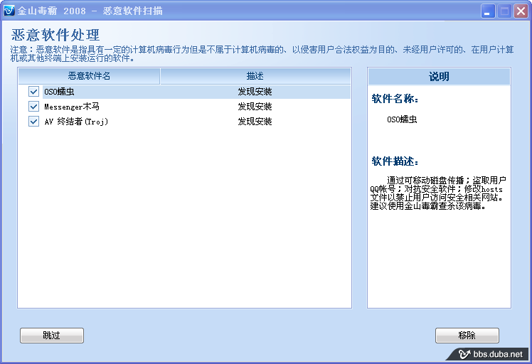 d)現(xiàn)在毒霸08全面查毒已經(jīng)有結(jié)果報告,首先發(fā)現(xiàn)了幾個惡意軟件,明顯,小瓢蟲運行后,下載安裝了更多惡意軟件,其中部分特征和AV終結(jié)者幾乎一樣,被判斷發(fā)現(xiàn)AV終結(jié)者。