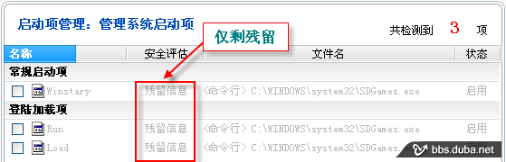 再來(lái)看啟動(dòng)項(xiàng),只剩下殘留信息,需要一個(gè)個(gè)選中后,修復(fù)掉。