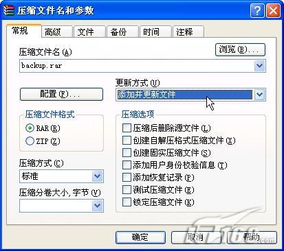 有時候要處理大量的文件,時間一長就不知道該備份哪些文件了,其實利用WinRAR的功能就能夠很輕松地備份文件,而且還可以保證是最新的呢!先將備份文件夾下的所有文件壓縮在一個backup.rar文件中。以后在WinRAR中選中這個備份文件夾,點下工具欄上的“添加”按鈕,并注意這時選擇更新模式為“添加新更新文件”(如圖10),這樣該備份文件夾下的所有文件全部加入到backup.rar文件中了,以后只要每天下班之前進(jìn)行同樣的操作,那只要打開這個文件,就能夠保證你的文件是最新的。