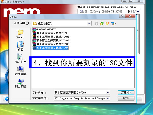 第四步,在彈出的對話框中,找到你想刻錄的格式為ISO的系統(tǒng)文件.并打開,如圖