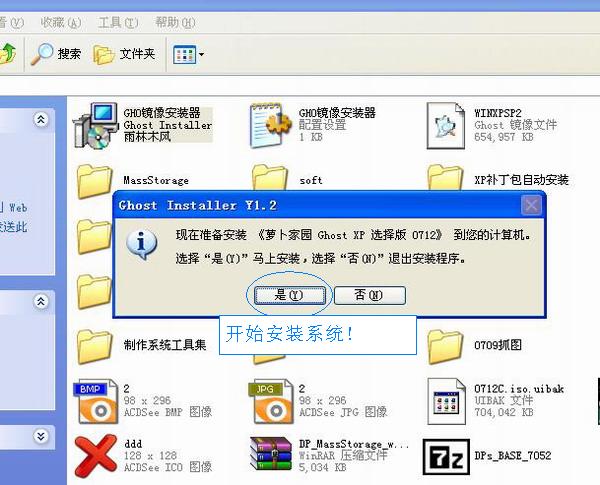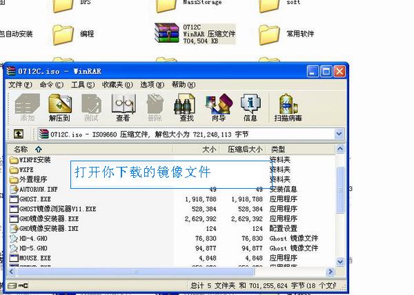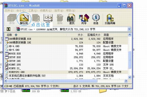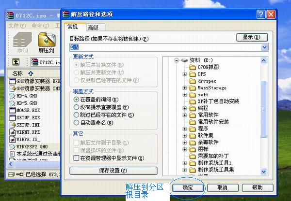 將下載的ISO文件用WinRAR打開,把其中的"GHO鏡像安裝器.exe"和"GHO鏡像安裝器.INI"(硬盤安裝器)、“WINXPSP2.GHO”解壓到硬盤根目錄,比如E:\. (請不要解壓到D盤,程序會發(fā)生錯(cuò)誤)