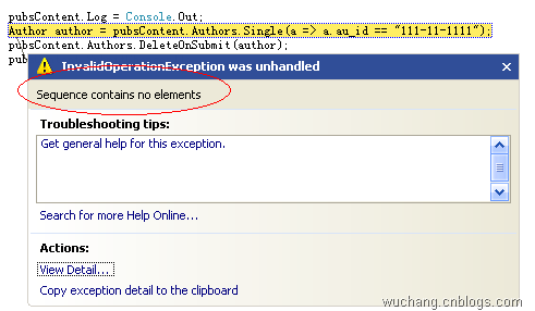從以前的學(xué)習(xí)中我知道,調(diào)用Single方法時DataContent即刻從數(shù)據(jù)庫中獲取數(shù)據(jù)庫,而這個時間如果獲取不到auid="111-11-1111"的記錄,返回的記錄集是空的,就引發(fā)了上面的異常。