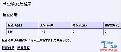 使用這個功能是請注意:因為數(shù)據(jù)庫讀寫關(guān)系可能有時需要多修復(fù)幾次才能完全修復(fù)成功,點(diǎn)擊后請耐心等待修復(fù)結(jié)果!修復(fù)后的檢查數(shù)據(jù)庫結(jié)果如下圖所示錯誤數(shù)為 0 則說明數(shù)據(jù)庫完好無損不用再修復(fù)了。