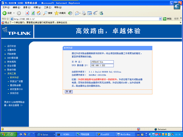 ③然后進(jìn)入路由器管理界面,“系統(tǒng)工具”——“軟件升級”,在“TFTP服務(wù)器IP”處填入自己電腦的ip地址,點擊升級即可。