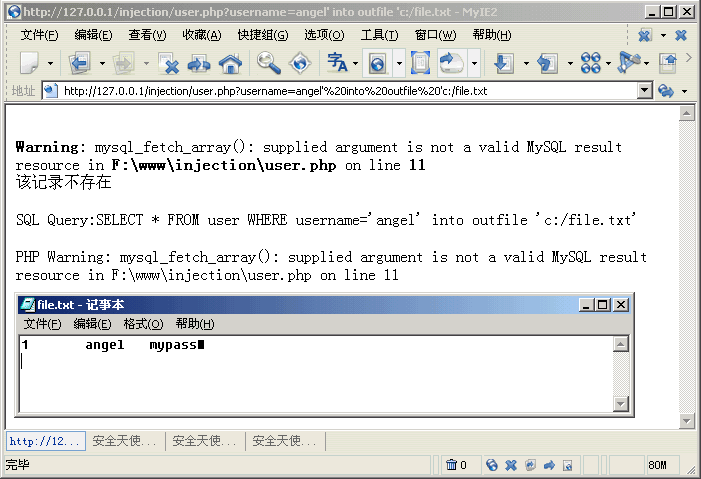 http://127.0.0.1/injection/user.php?username=angel' and password='mypass |