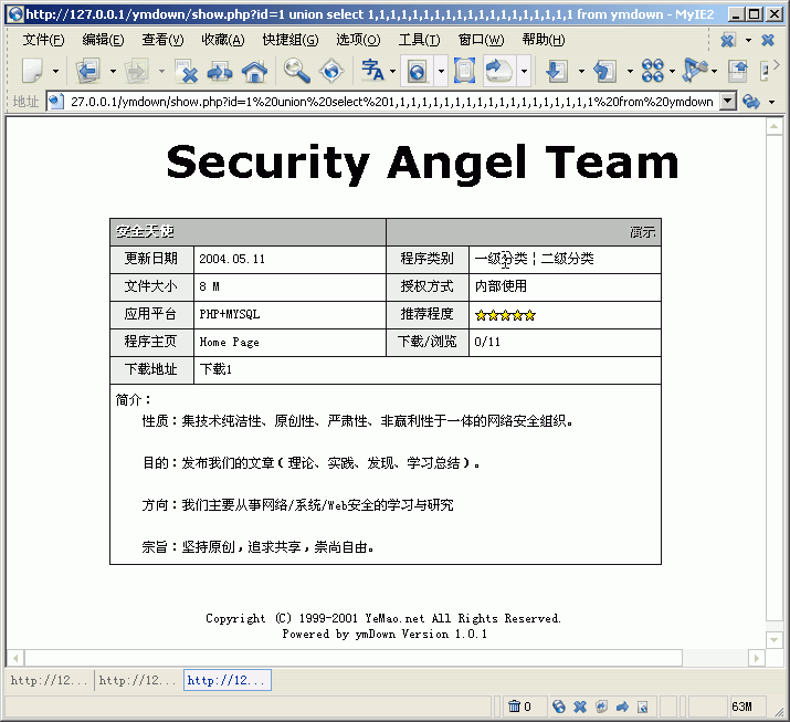 用戶名和密碼的數(shù)據(jù)類型都是varchar,所以我們要選擇ymdown表里數(shù)據(jù)類型是varchar來,如果把varchar的數(shù)據(jù)寫到int的地方當(dāng)然是不可能顯示的了,由于updatetime(更新日期)的長度是20,可能會出現(xiàn)顯示不完全的情況,我們就把用戶名顯示在name(軟件標(biāo)題)那里,密碼顯示在size(文件大?。┠抢锖昧耍?9個(gè)“1”中,name和size分別是第二個(gè)和第四個(gè),我們提交: